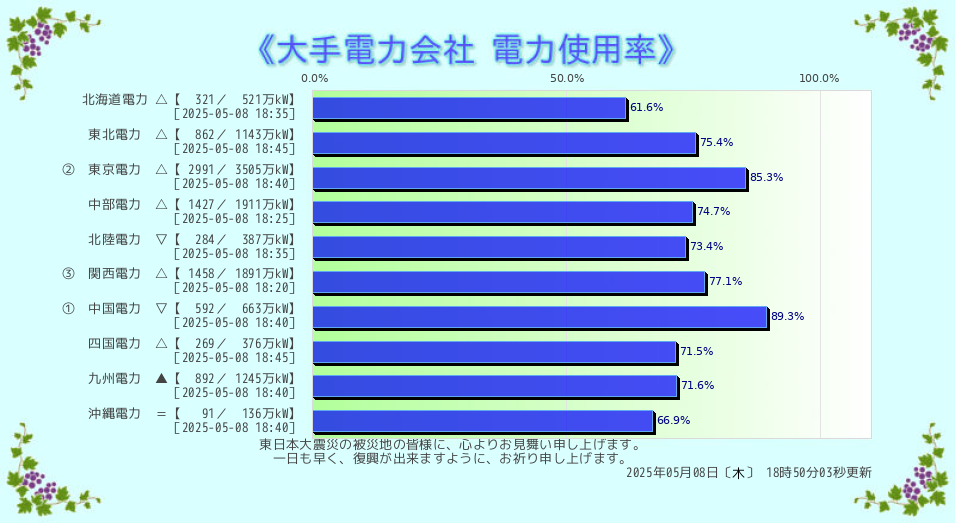 【△・▽・▲・▼・=】 各電力会社の電力消費量の最新の物と、その一つ前の時間の情報との比較を表わしております。